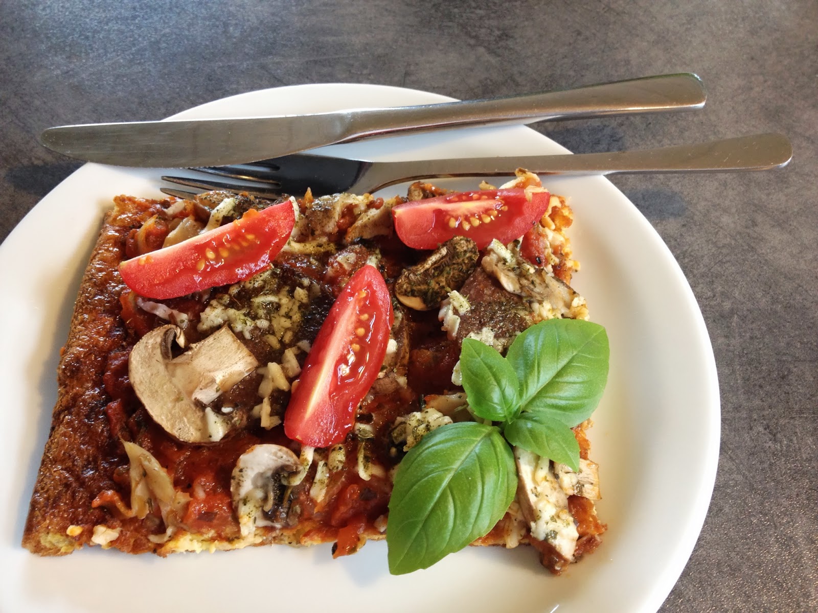 Bunden(e) toppes med dit yndlingsfyld; her blev det tomatsauce fra auberginegratinen, oksekødssalami, svampe, revet Pecorino og tørret oregano.